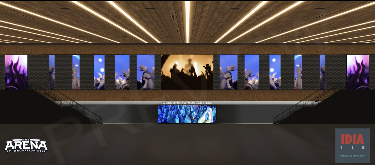 The Arena at Noblesville, Indiana, invited the Institute for Digital Intermedia Arts (IDIA Lab) at Ball State University to develop innovative design concepts for a series of large-scale LED signage installations within its public concourse. IDIA Lab’s vision integrated contextual event-based programming with immersive, interactive experiences that united content on the main atrium and second floor levels. The mezzanine features a segmented array of LED displays functioning as a dynamic video wall, where coordinated visual content plays across multiple panels to create a cohesive yet evolving media environment. On the main floor, visitors could actively engage with the space through sensors that captured movement and gestures, generating responsive layers of image and sound that transform in real time. Together, these design concepts transformed the concourse into a digital ecosystem where architecture, technology, and audience interaction converge.